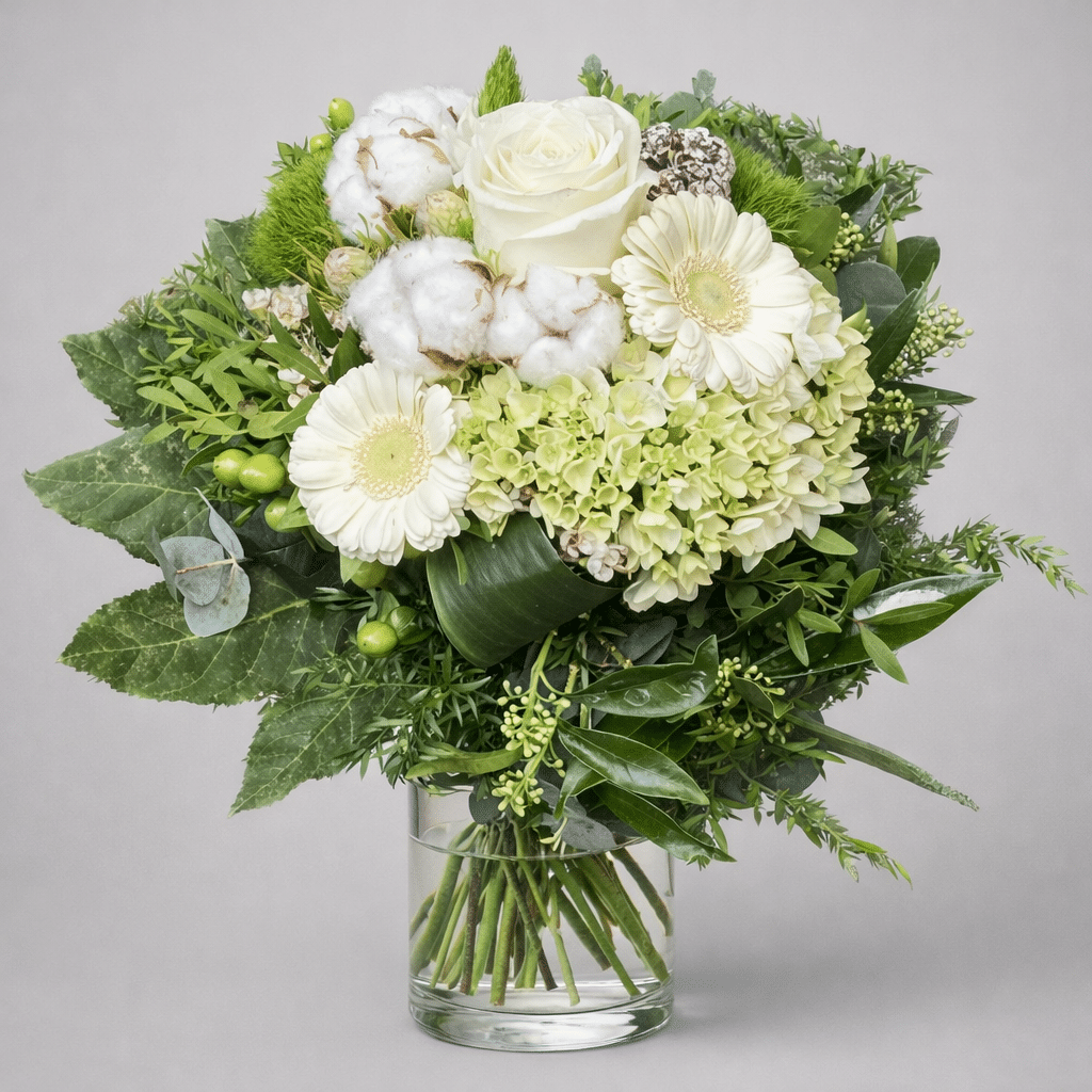 Strauß mit weißen Rosen im Zentrum die umrahmt werden mit verschiedenen anderen Blüten und schönem Beiwerk
