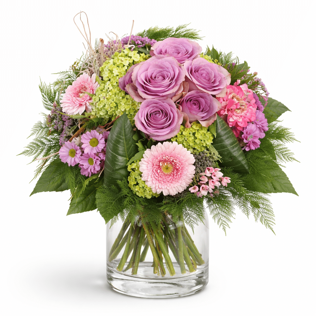 Ein rundgebundener Strauß mit Rosen und Gerberas in rosé