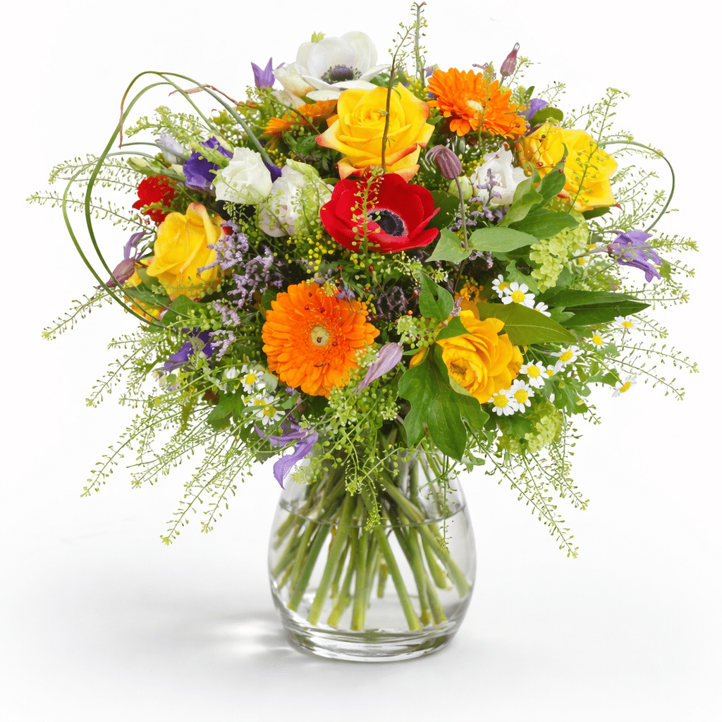 Ein lebhafter Strauß mit Rosen, Gerbera, Kamille, Clematis und zartem Grün – frische Farben und natürliche Eleganz für jeden Anlass
