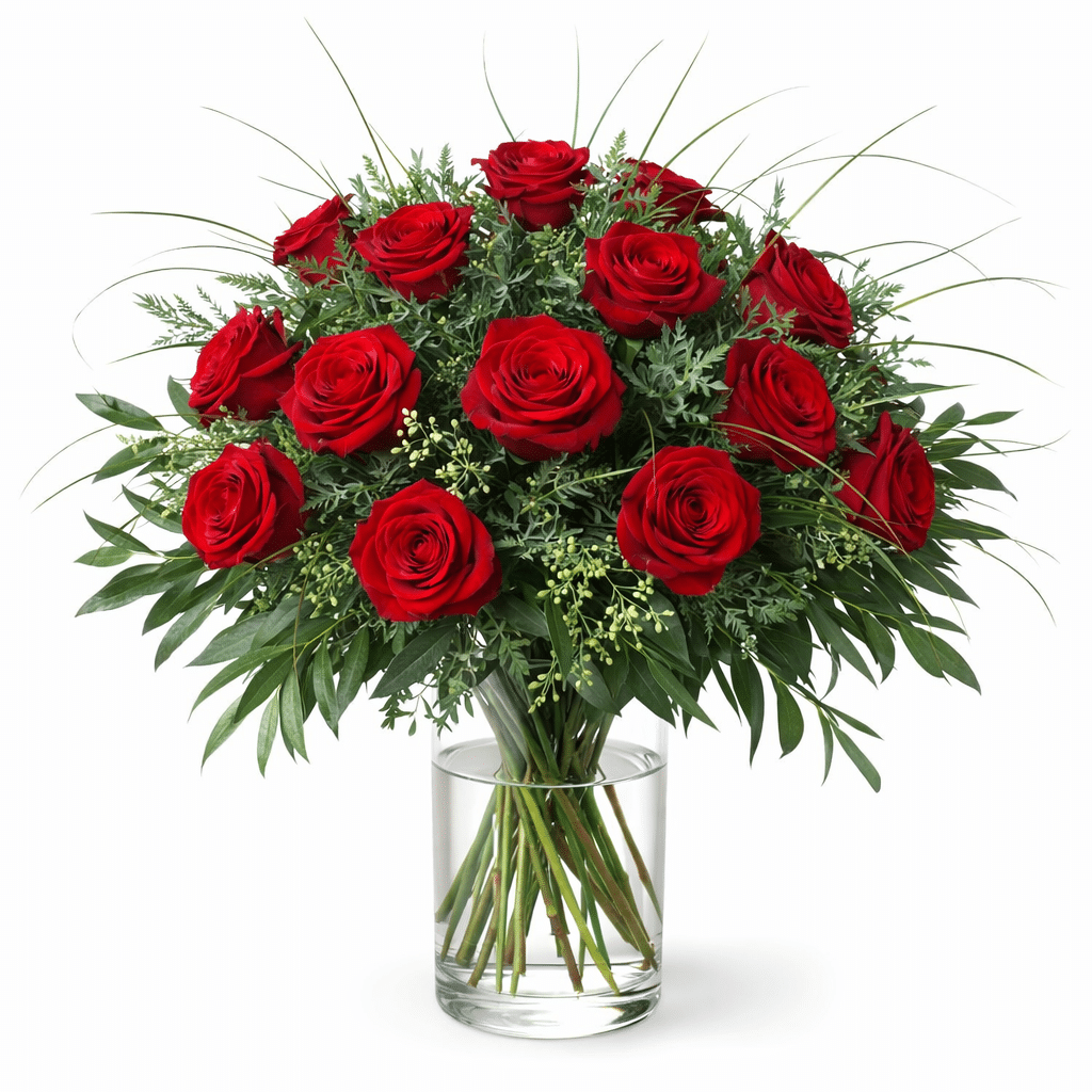 Strauß Rosen in den Farben der Wahl. Unterlegt mit passendem Beiwerk. Mindestens 10 Stiele.
