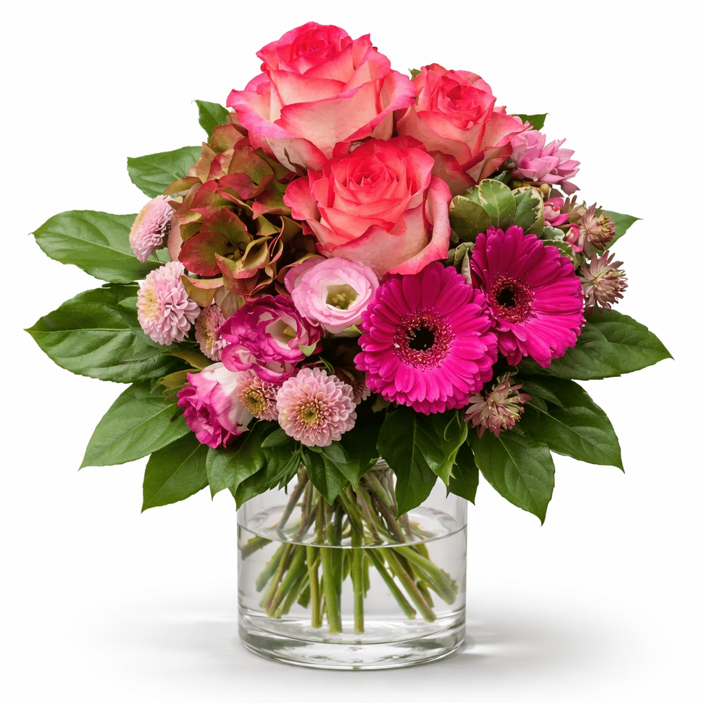 rundgebundener Strauß in rosa-pink mit Rosen, Gerbera, Ranukeln, Bouwardien und zartem Beiwerk