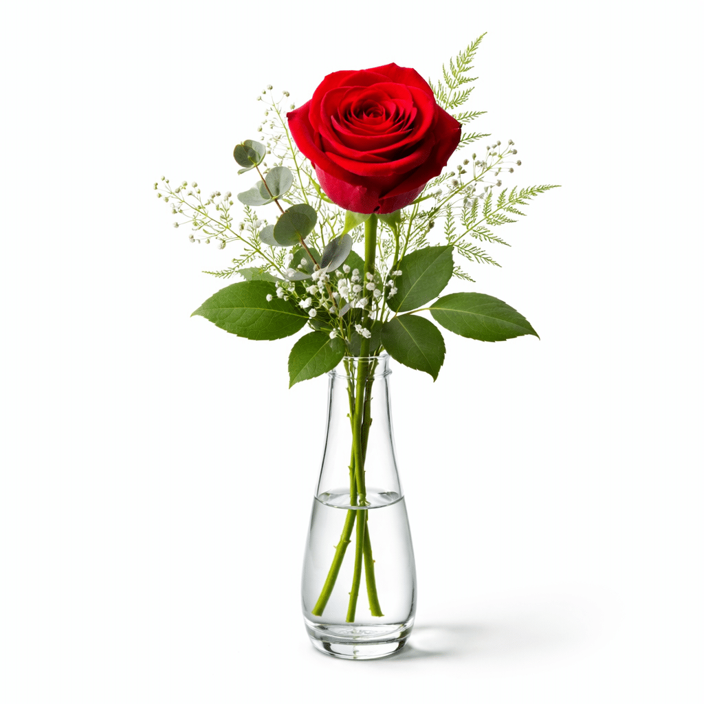 Einzelne rote, langstielige und großblütige Rose mit etwas Beiwerk.