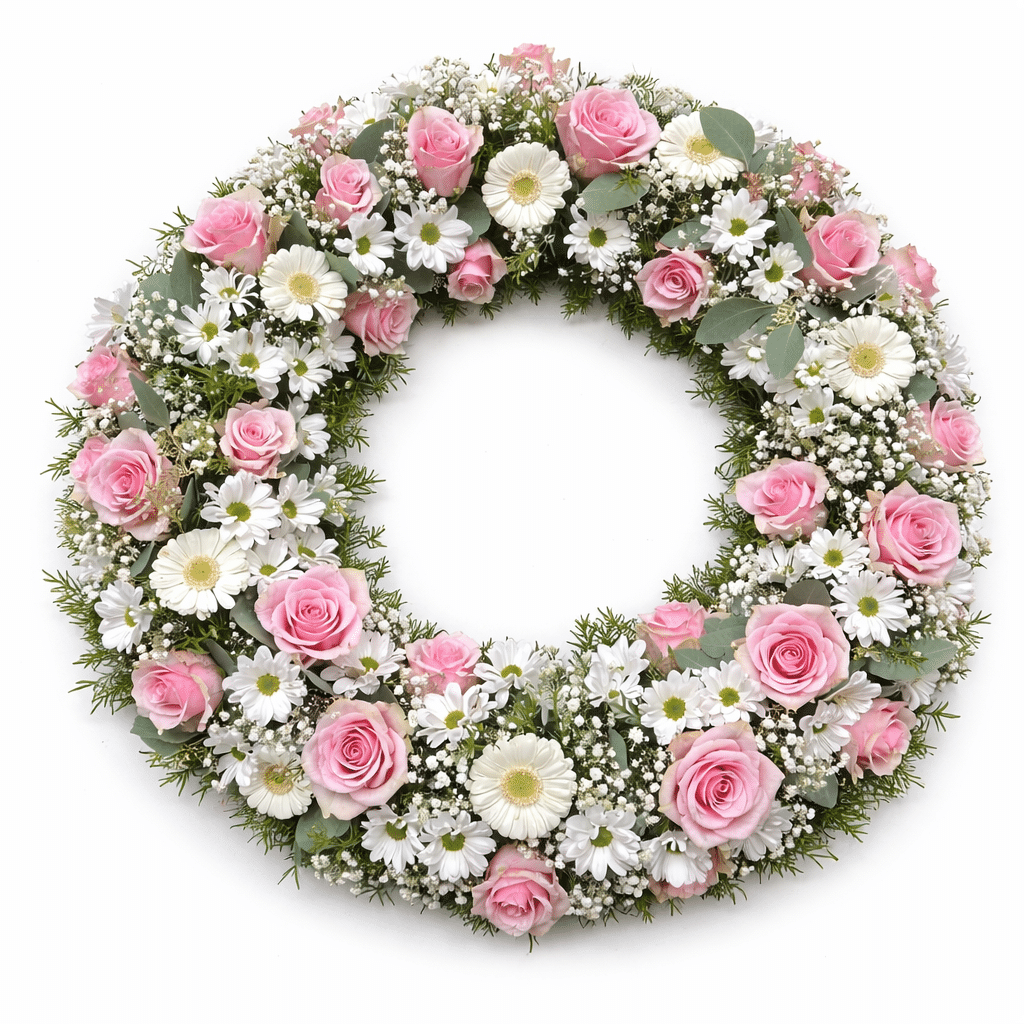 Trauerkranz rundum mit Blüten locker besteckt. Die Preisgruppen unterscheiden sich durch Unterlagengröße ( 46cm, 55cm und 65cm)