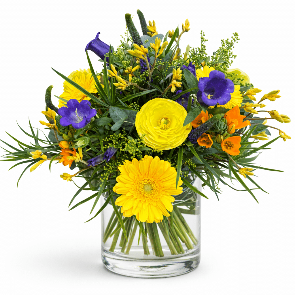 Strahlender Strauß in Gelb und Blau mit Gerbera, Ranukeln und Freesien