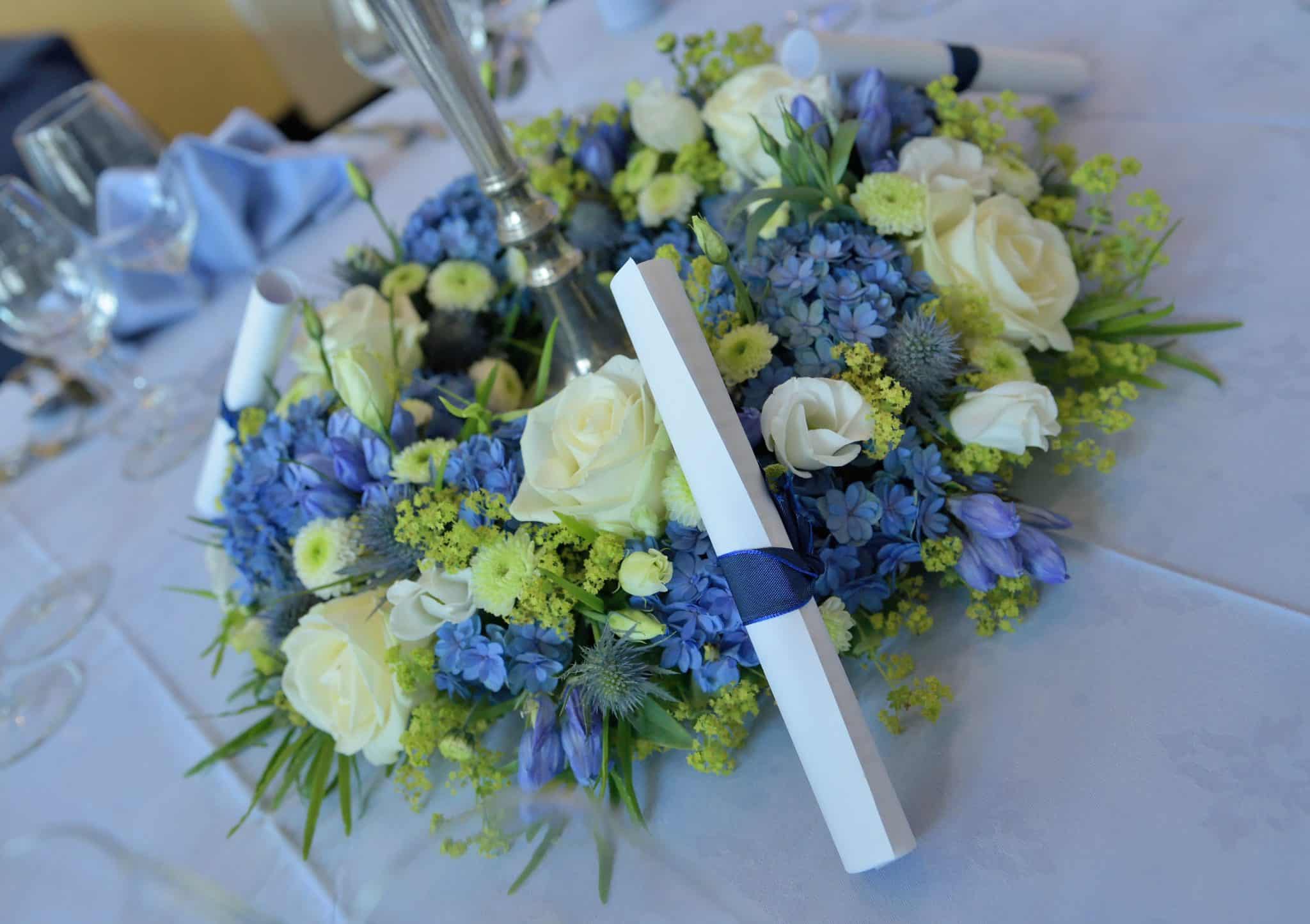Filigran gestecktes Tischkränzchen mit Blumen der Saison. Wahlweise andere Farbkombinationen ( Bei „Bemerkung“ vermerken)