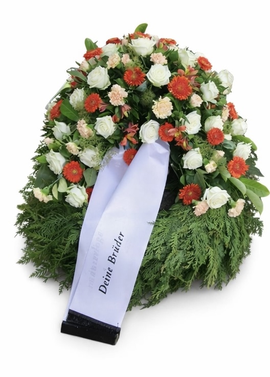 Trauerkranz mit einer Blumendekoration auf einer mit Grün umwickelten Unterlage ( Unterlage 70cm).