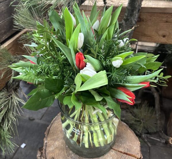 lockerer, moderner Strauß mit bunten Tulpen und grünem Beiwerk