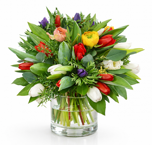 bunter Tulpenstrauß kombiniert mit Blumen der Saison